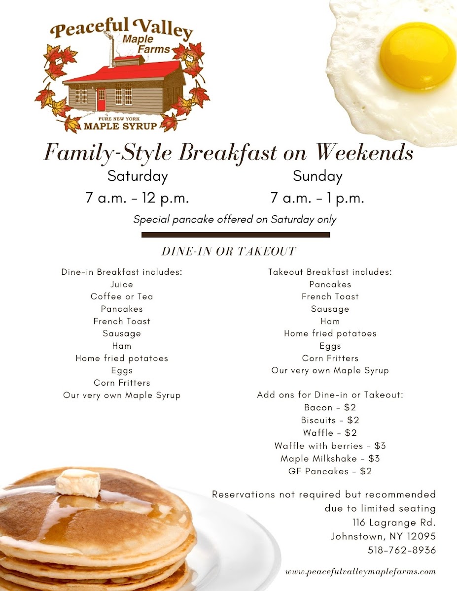 Whether you're looking for something sweet, savory, or hearty, the menu at Peaceful Valley Maple Farms offers something for everyone, making it a great destination for those in the area.